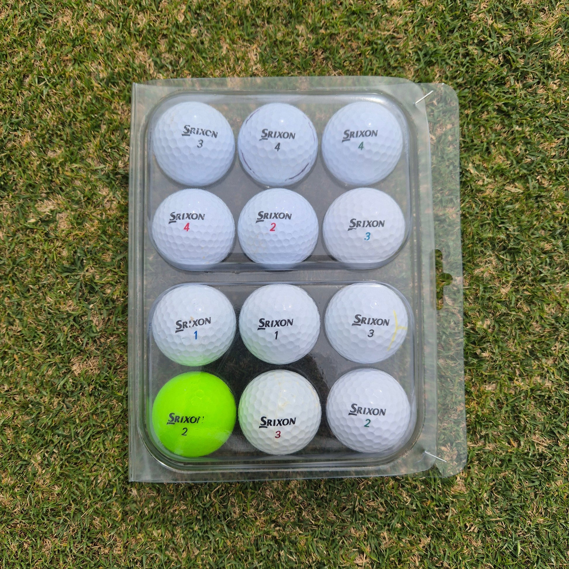 12 random washed and cleaned Srixon golf balls.